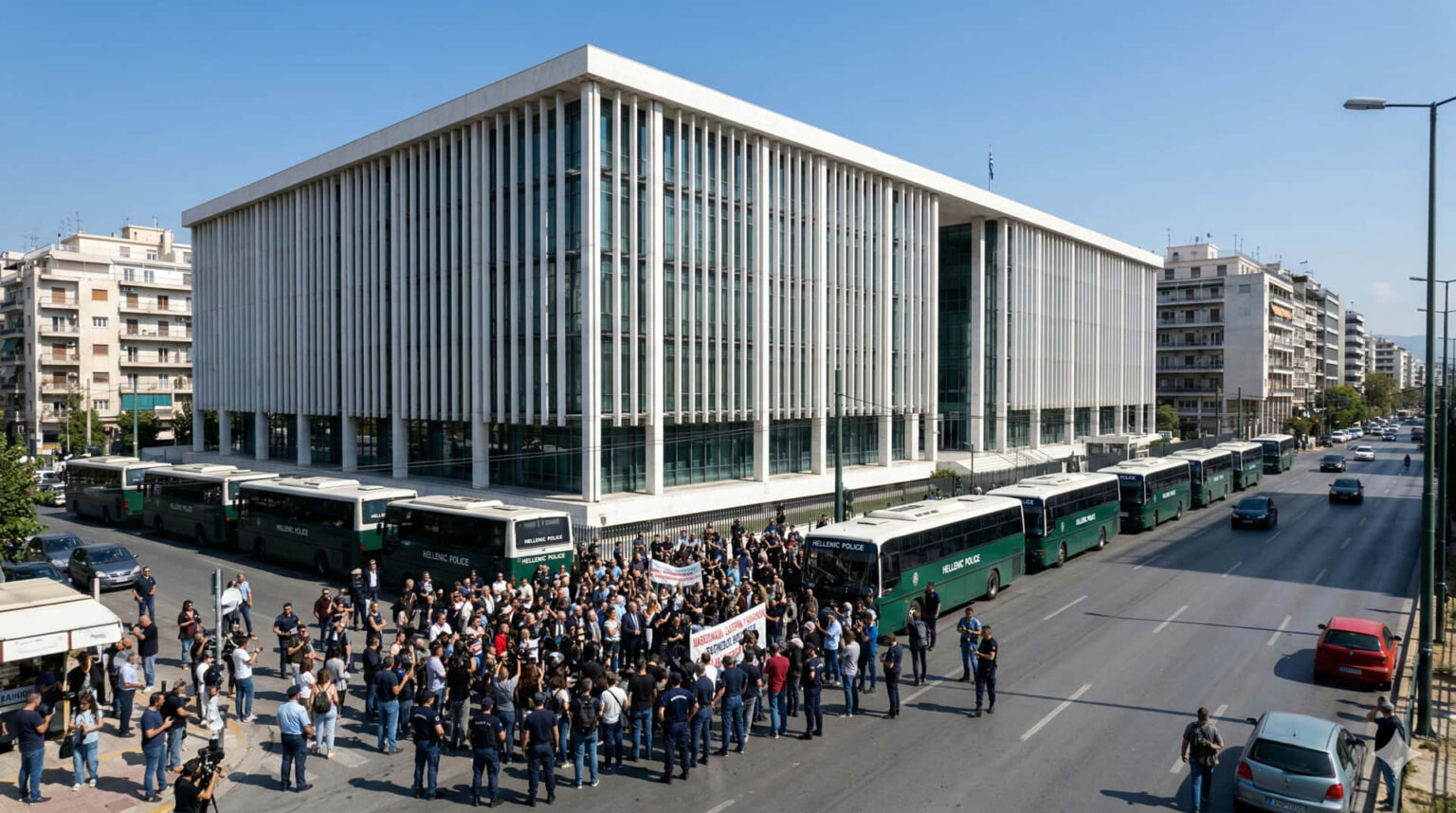 Vor und im Gebäude des Athener Berufungsgerichts herrschten am Tag der Urteilsverkündung massive Sicherheitsmaßnahmen. Entlang der Alexandras-Allee positionierte die griechische Polizei (ELAS) mindestens zehn Einsatzfahrzeuge, während sich bereits in den frühen Morgenstunden zahlreiche Beobachter vor dem Justizgebäude versammelten. In dem dicht gedrängten Gerichtssaal verfolgten Angehörige und Sympathisanten den Ausgang des entscheidenden Verfahrens.