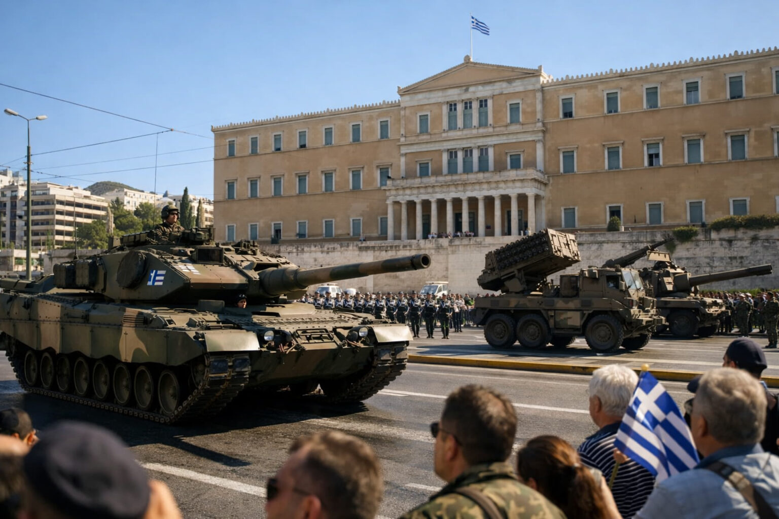 Darüber hinaus umfasst das Luftprogramm koordinierte Überflüge von modernen Kampfflugzeugen. Konkret sind Maschinen des Typs Rafale sowie Mirage 2000-5 im Einsatz, die am strahlenden Himmel über Athen für eine markante Kulisse sorgen. Das große Aufgebot an Menschen, das die Straßen der Innenstadt säumt, verfolgt sowohl die Einheiten am Boden als auch die Flugmanöver mit anhaltendem Interesse. Die Veranstaltung wird planmäßig fortgesetzt, während die teilnehmenden Einheiten ihre Route durch das Zentrum abschließen.