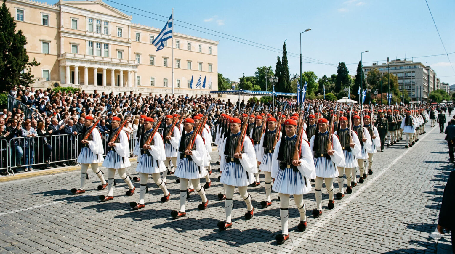 - Die zentrale Militärparade findet vor dem Parlament am Syntagma-Platz statt.