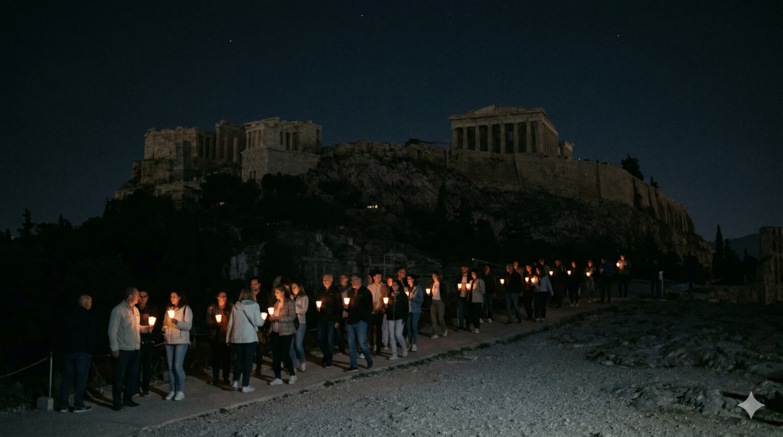 Im Hintergrund dominierte die unbeleuchtete Akropolis das nächtliche Panorama. Das Fehlen der ansonsten markanten Flutlichtanlage veränderte das gewohnte Stadtbild komplett. Diese bewusste visuelle Leere sollte die kollektive Notwendigkeit unterstreichen, die natürlichen Ressourcen der Erde besser zu bewahren und den Umweltschutz in den Fokus zu rücken.