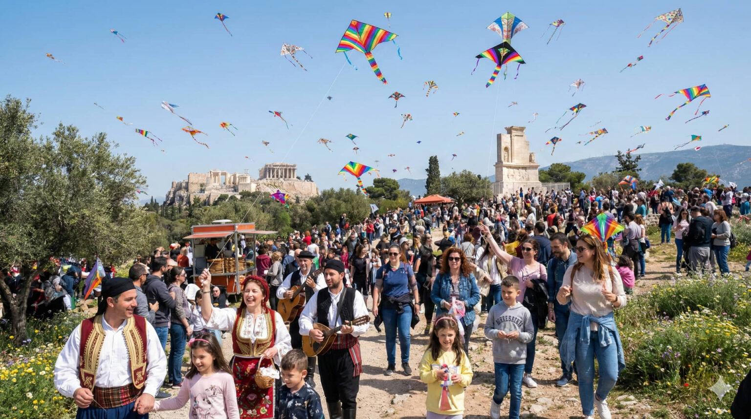 Dieser Brauch, der den Übergang in die vierzigtägige Vorbereitungszeit auf das orthodoxe Osterfest markiert, wird klassischerweise im Freien mit dem Steigenlassen von Flugdrachen und dem Verzehr spezieller fleischloser Speisen zelebriert. Der Hügel direkt gegenüber der Akropolis verwandelte sich dabei in einen zentralen Treffpunkt, an dem die Stadtverwaltung ein umfassendes Kultur- und Gastronomieprogramm für die breite Öffentlichkeit organisierte.