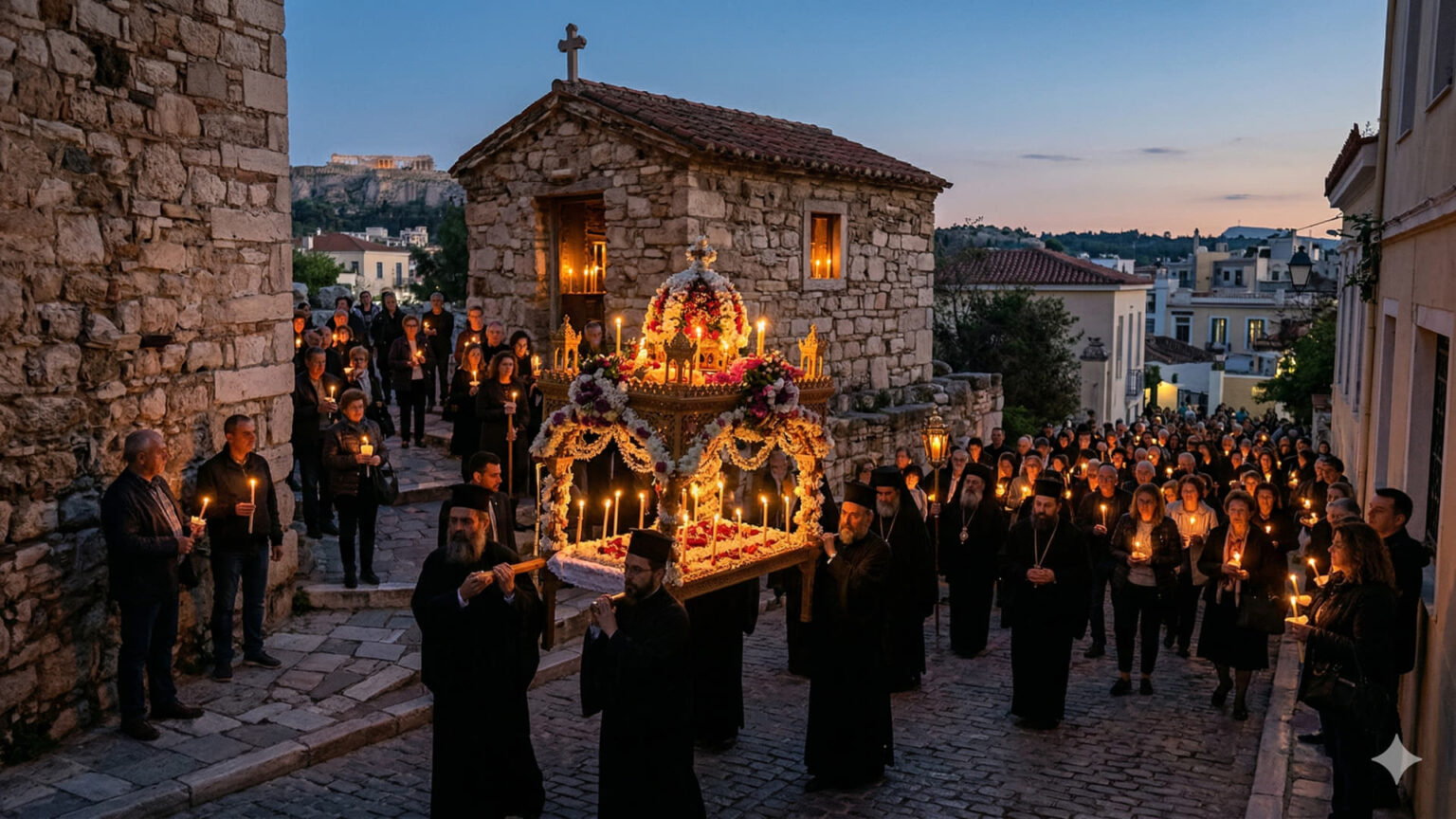 In einer Atmosphäre tiefer spiritueller Andacht wird am späten Nachmittag und Abend die Liturgie der Klagelieder abgehalten. Dabei werden traditionelle Lobpreisungen (Enkomia) gesungen, die das Zentrum der musikalischen Andacht bilden. Im Anschluss beginnt der feierliche Umzug des reich geschmückten Epitaphs durch die Straßen der griechischen Städte und Dörfer. Die Gläubigen begleiten die zeremonielle Prozession zu Fuß und mit brennenden Kerzen in den Händen.