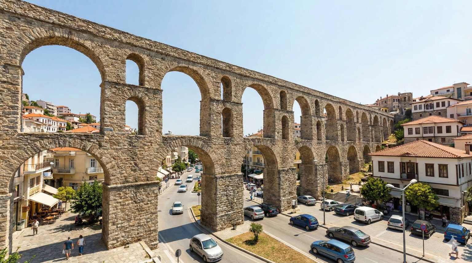 Kavala – Im Herzen der nordgriechischen Hafenstadt erhebt sich ein historisches Monument, das die städtische Identität bis heute maßgeblich prägt: das alte Aquädukt, lokal als “Kamares” bekannt. Das markante Wahrzeichen, dessen heutige Struktur aus dem 16. Jahrhundert stammt, überspannt die Senke zwischen der Halbinsel Panagia und den gegenüberliegenden Anhöhen. Ursprünglich geht die Wasserleitung vermutlich auf römische Zeiten zurück und diente bis in das frühe 20. Jahrhundert der städtischen Wasserversorgung.