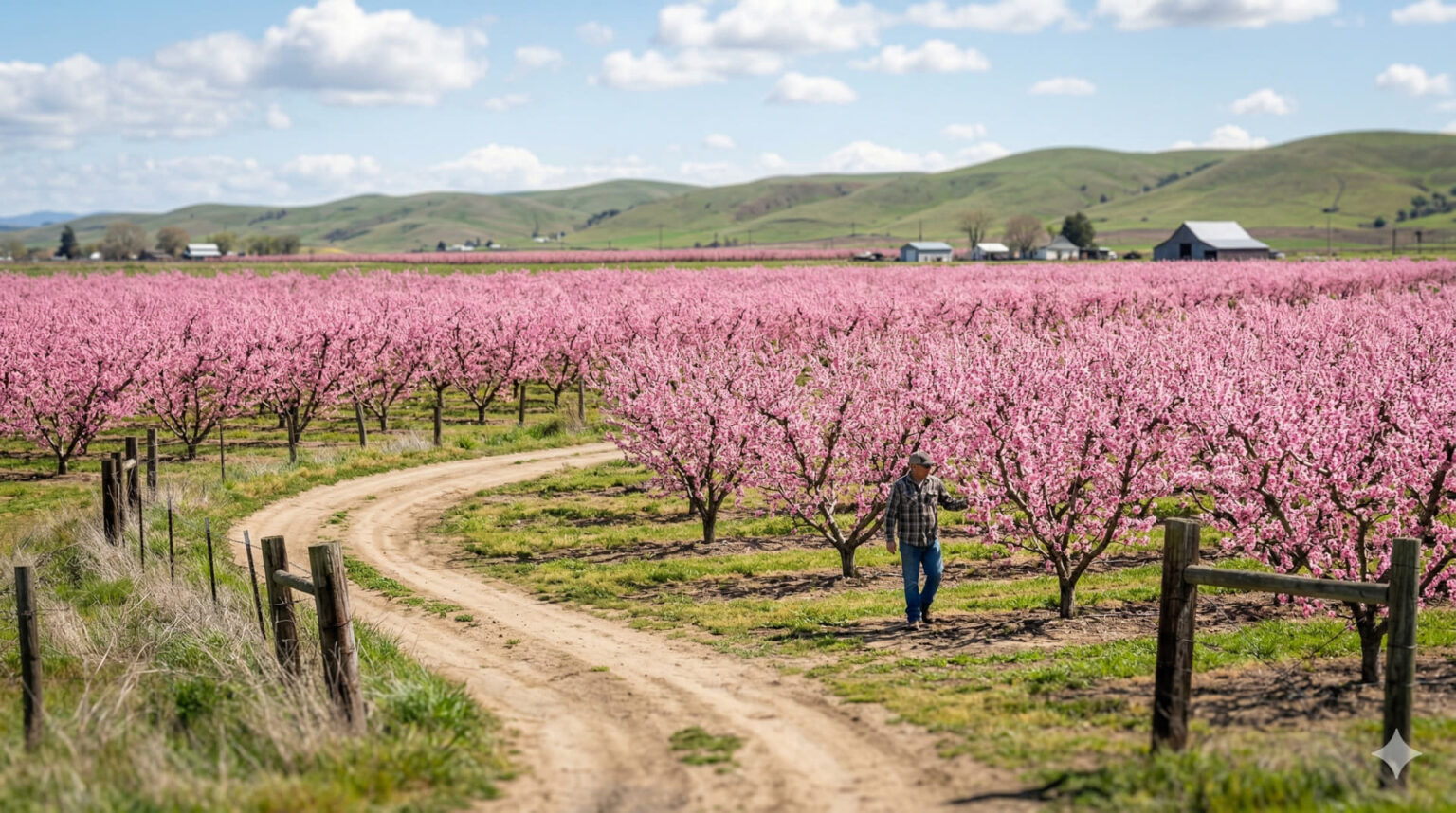 - 170 Quadratkilometer große Anbaufläche für Pfirsiche blüht in Rosa.