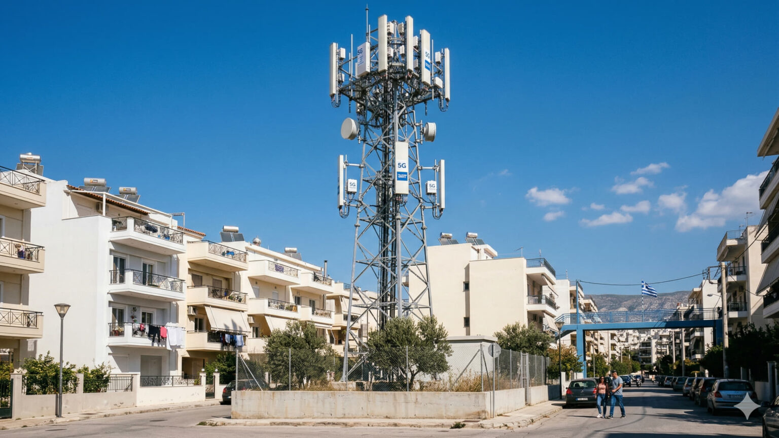 Ein moderner 5G-Sendemast vor blauem Himmel in Griechenland, der den Ausbau der neuen Telekommunikationsinfrastruktur symbolisiert.