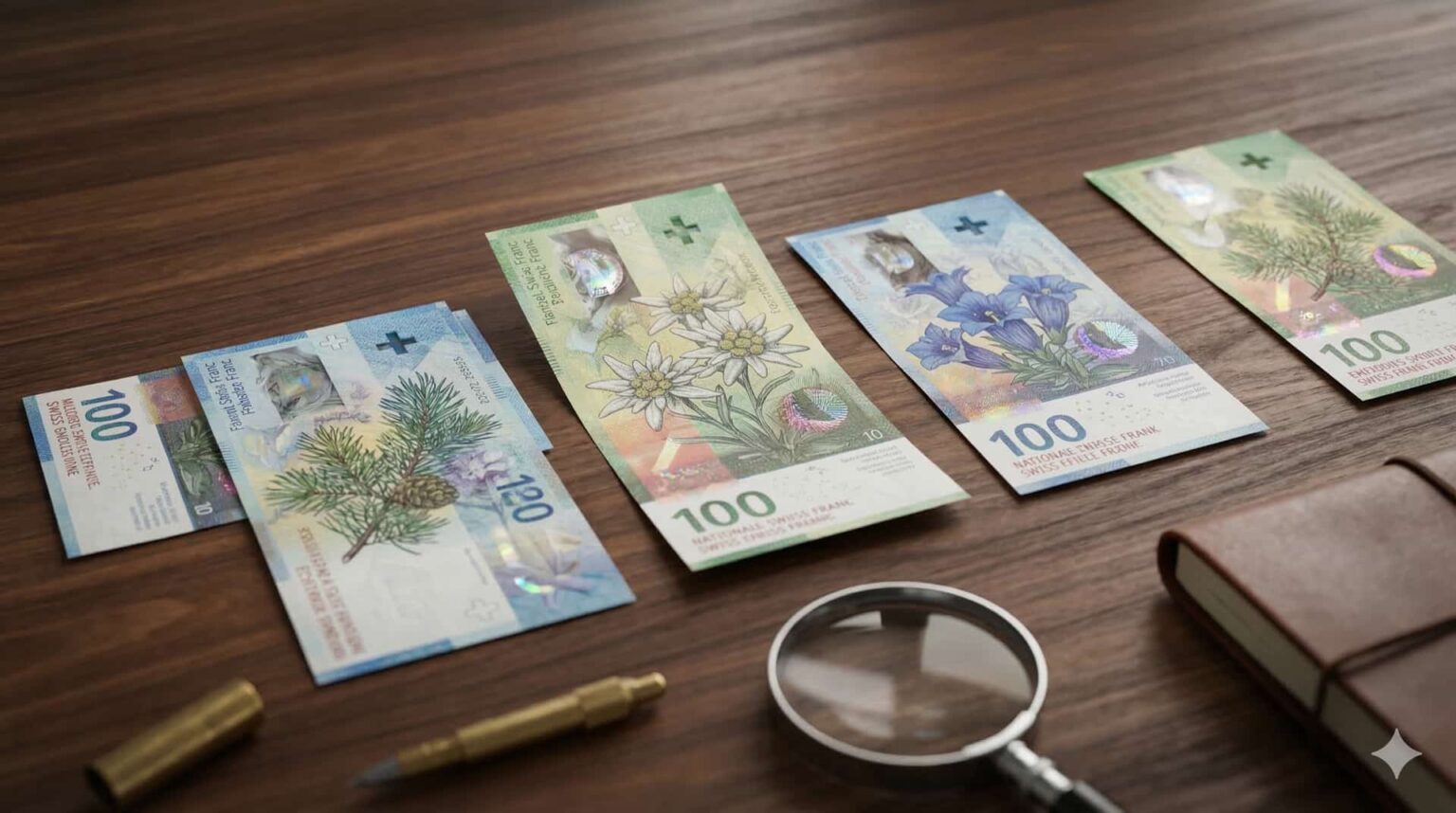 Στις μεγαλύτερες αξίες, το χαρτονόμισμα των εκατό φράγκων κοσμείται από θάμνους βατόμουρου και αυτό των χιλίων φράγκων από την αλπική νεραγκούλα.