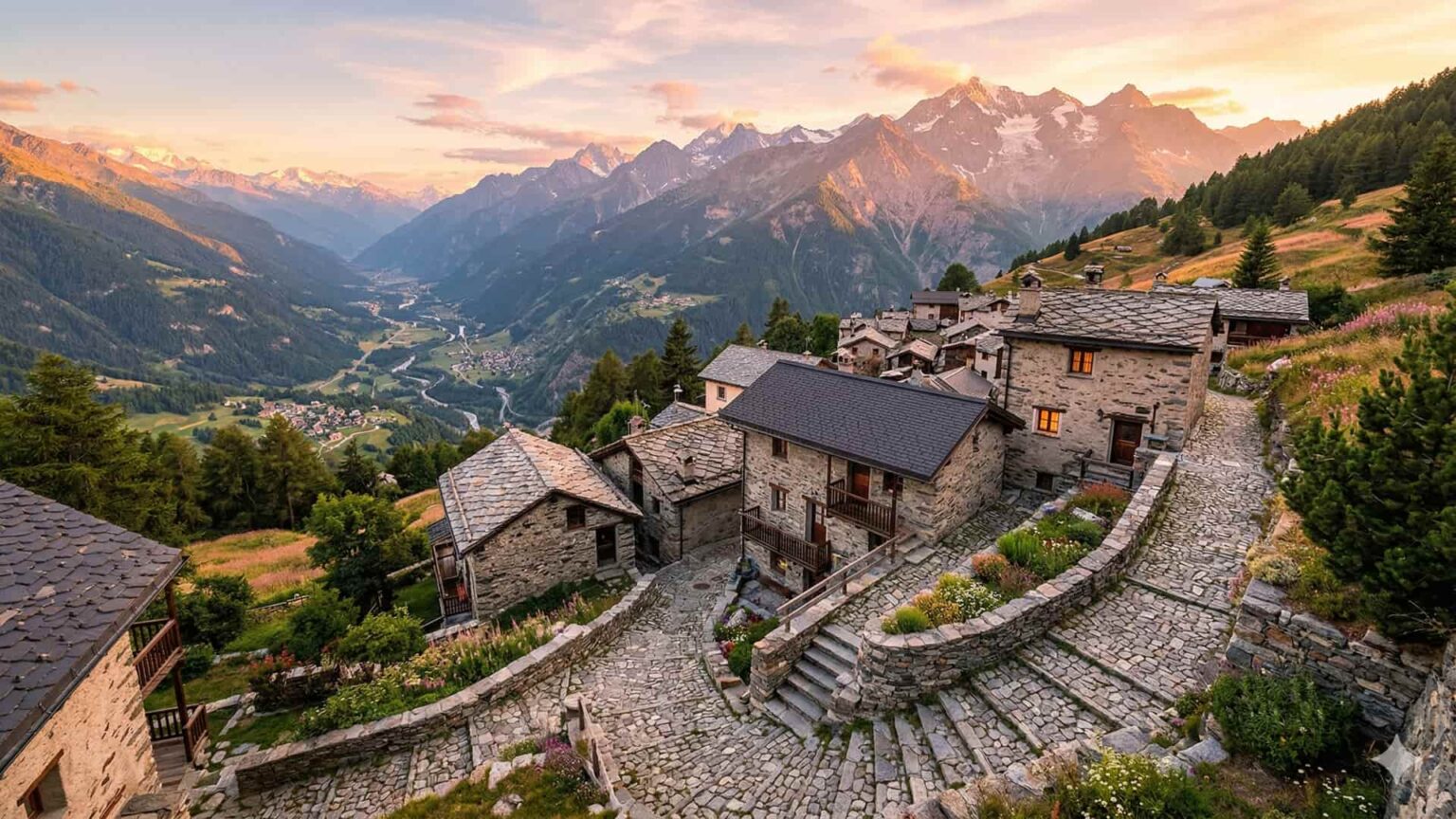 Κατά τις απογευματινές ώρες, ολόκληρο το χωριό βυθίζεται σταδιακά σε έντονες αποχρώσεις του χρυσού και του ροζ, δημιουργώντας ένα οπτικό αποτέλεσμα που κυριαρχεί στην κοιλάδα.