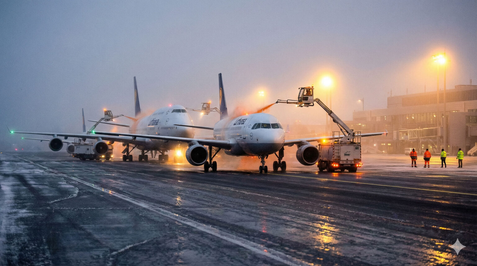 Στο αεροδρόμιο της Φρανκφούρτης, τη σημαντικότερη αεροπορική πύλη της χώρας, η κατάσταση παραμένει εξαιρετικά τεταμένη. Ήδη έχουν ακυρωθεί περίπου 100 πτήσεις, ενώ ο αριθμός αυτός ενδέχεται να αυξηθεί. Η διαχειρίστρια εταιρεία Fraport έχει θέσει σε λειτουργία 34 ειδικά οχήματα για την αποπαγοποίηση των αεροσκαφών και καλεί τους επιβάτες να προσέρχονται στα τερματικά τουλάχιστον τρεις ώρες πριν από την πτήση τους.