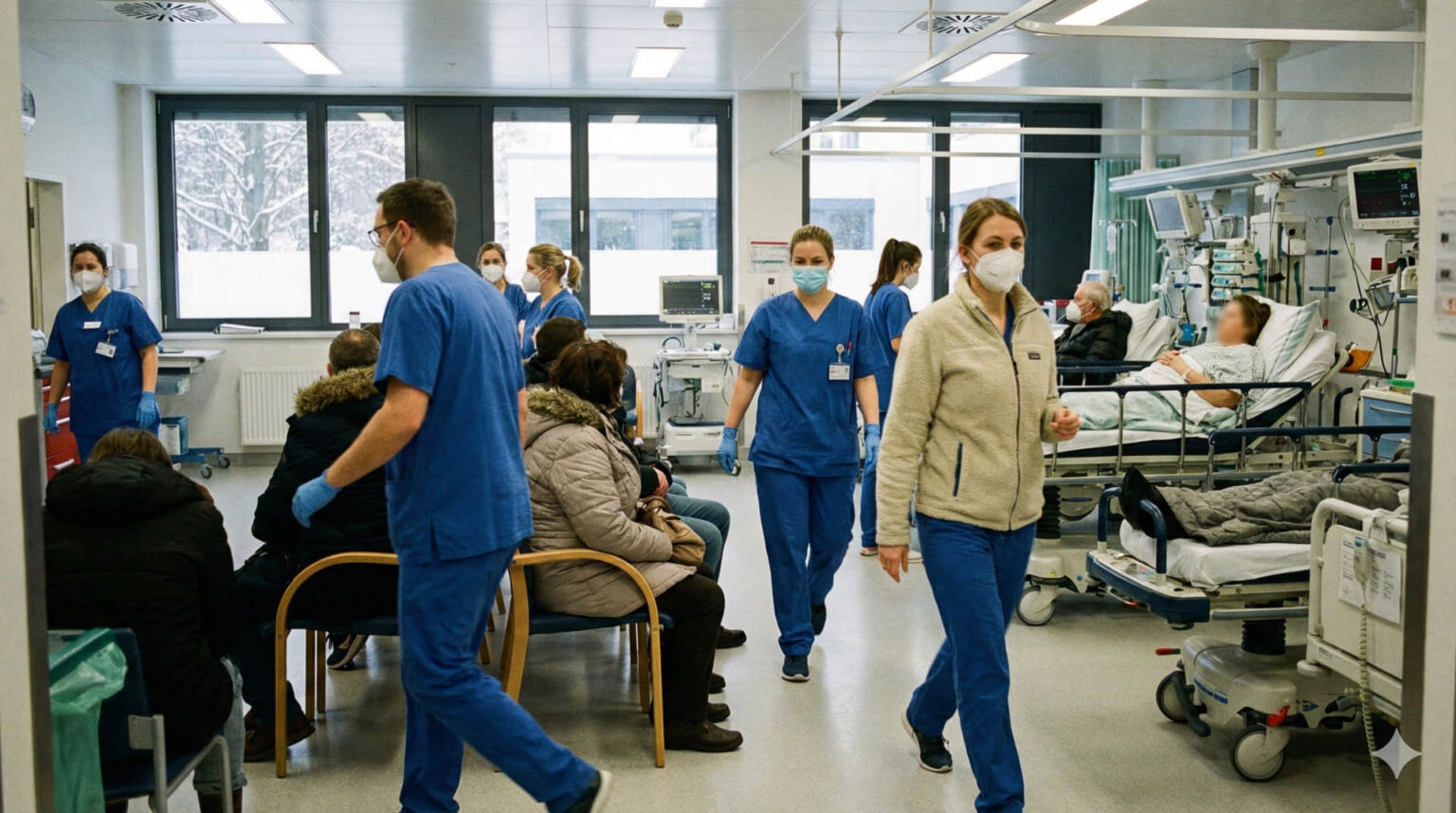 Η εικόνα, όπως περιγράφεται, μεταφράζεται σε αυξημένη πίεση για γιατρούς, νοσηλευτικό προσωπικό και τα ΤΕΠ, σε μια περίοδο όπου οι λοιμώξεις έρχονται σε κύματα και ο χειμώνας διαμορφώνεται ως «ταραχώδης» για το σύστημα υγείας στον βορρά.