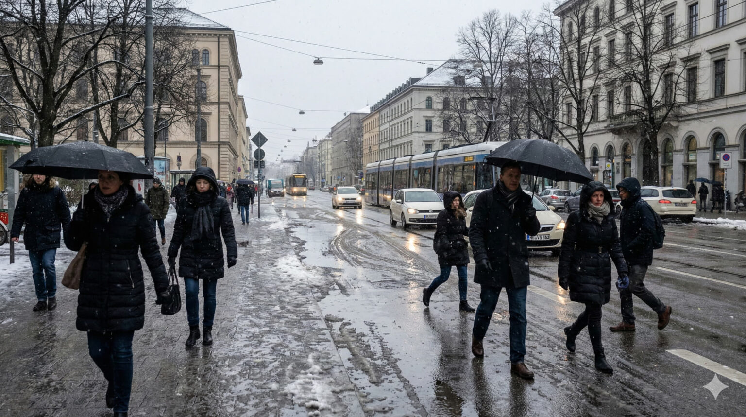 Μόναχο – Με ένα ιδιαίτερα άστατο και «ανήσυχο» καιρικό σκηνικό ξεκίνησε η νέα εβδομάδα για τους κατοίκους της βαυαρικής πρωτεύουσας, επιβεβαιώνοντας πως ο χειμώνας διατηρεί ακόμη ισχυρή την παρουσία του στην περιοχή. Τη νύχτα προς τη Δευτέρα 16 Φεβρουαρίου, η πόλη δέχθηκε αξιόλογες ποσότητες χιονιού για μερικές ώρες, ωστόσο το σκηνικό άλλαξε γρήγορα καθώς ένα μέτωπο βροχής με ηπιότερες θερμοκρασίες μετέτρεψε το χιόνι σε λάσπη, δημιουργώντας δύσκολες συνθήκες μετακίνησης κατά τις πρωινές ώρες αιχμής.