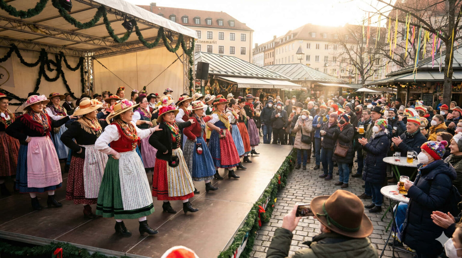 Το απόλυτο highlight της ημέρας, που αποτελεί και το σήμα κατατεθέν του μασκαρέματος στο Μόναχο, είναι προγραμματισμένο για το απόγευμα. Περίπου στις 18:00, αναμένεται να ξεκινήσει ο διάσημος «Χορός των Γυναικών της Αγοράς» (Tanz der Marktfrauen). Πρόκειται για μια παράδοση δεκαετιών, όπου οι γυναίκες που διατηρούν πάγκους στο Viktualienmarkt, ντυμένες με εντυπωσιακές, χειροποίητες στολές, παρουσιάζουν μια χορογραφία που προετοιμάζουν μήνες πριν.