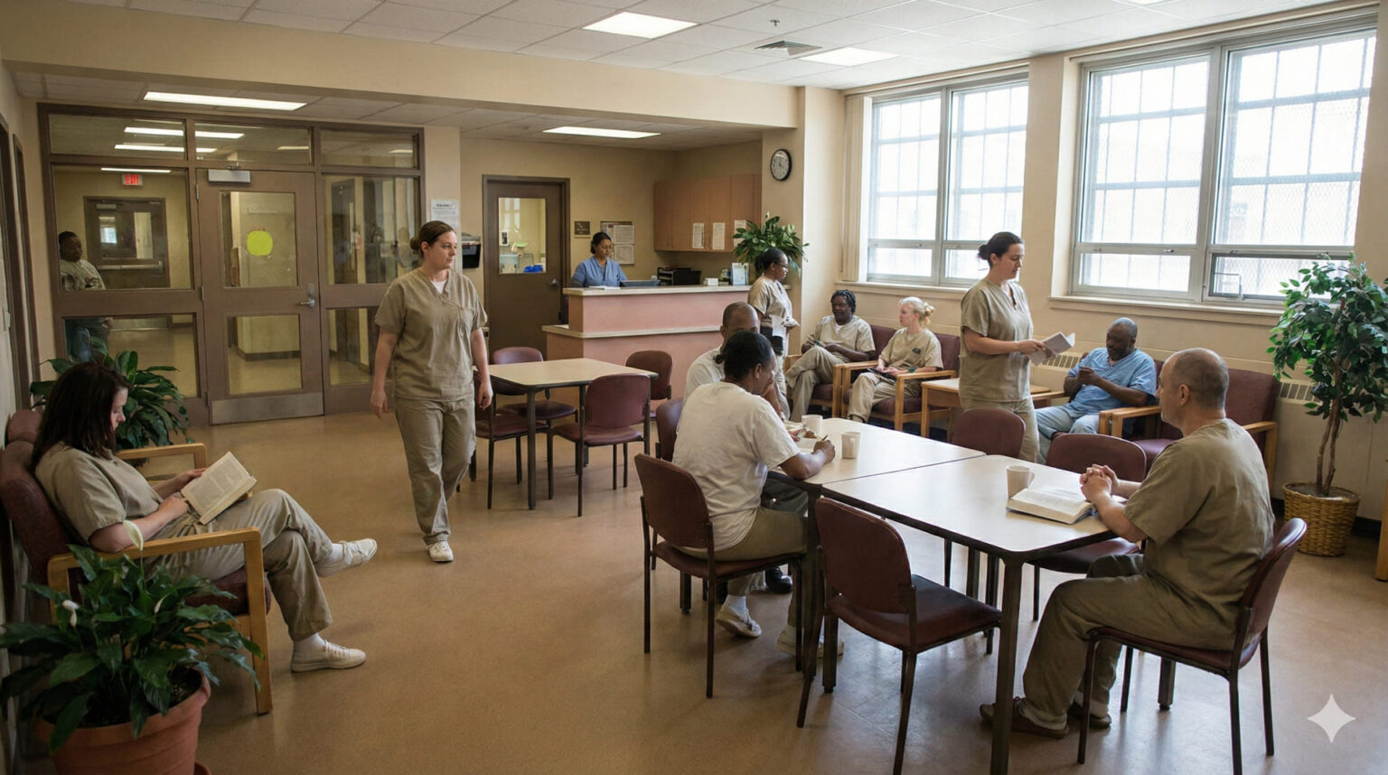 Παρά τα μέτρα ασφαλείας, η θεραπευτική προσέγγιση ξεκινά από την πρώτη ημέρα. Τα δωμάτια διαθέτουν μεγάλα παράθυρα με θέα σε πράσινο χώρο, ενώ υπάρχει εσωτερική αυλή με περιορισμένη αλλά ελεγχόμενη πρόσβαση. Άνδρες και γυναίκες φιλοξενούνται στις ίδιες πτέρυγες, με δυνατότητα απομόνωσης όταν απαιτείται.
