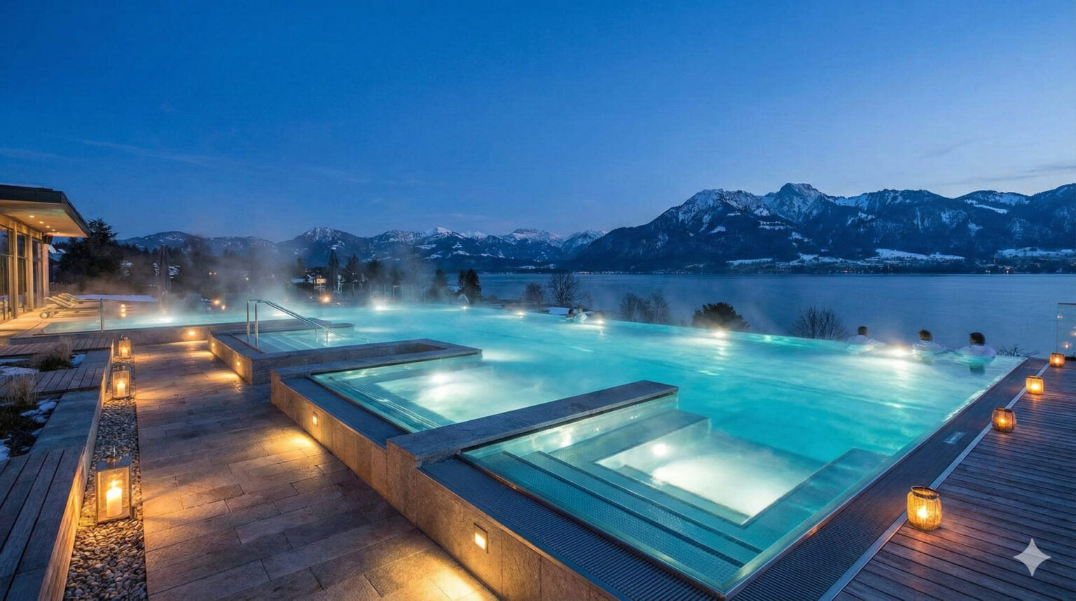 Το εξωτερικό τμήμα της εγκατάστασης αποτελεί ίσως το πιο φωτογραφημένο σημείο του συγκροτήματος. Η εξωτερική πισίνα, η οποία παραμένει προσβάσιμη καθ’ όλη τη διάρκεια του έτους, δίνει την αίσθηση ότι ενώνεται με τα νερά της λίμνης, προσφέροντας ένα εντυπωσιακό πανόραμα. Ειδικά κατά τους χειμερινούς μήνες, η αντίθεση του ζεστού νερού με τον κρύο αέρα και το χιονισμένο τοπίο των Άλπεων στο βάθος, καθιστά την επίσκεψη μια αξέχαστη εμπειρία.
