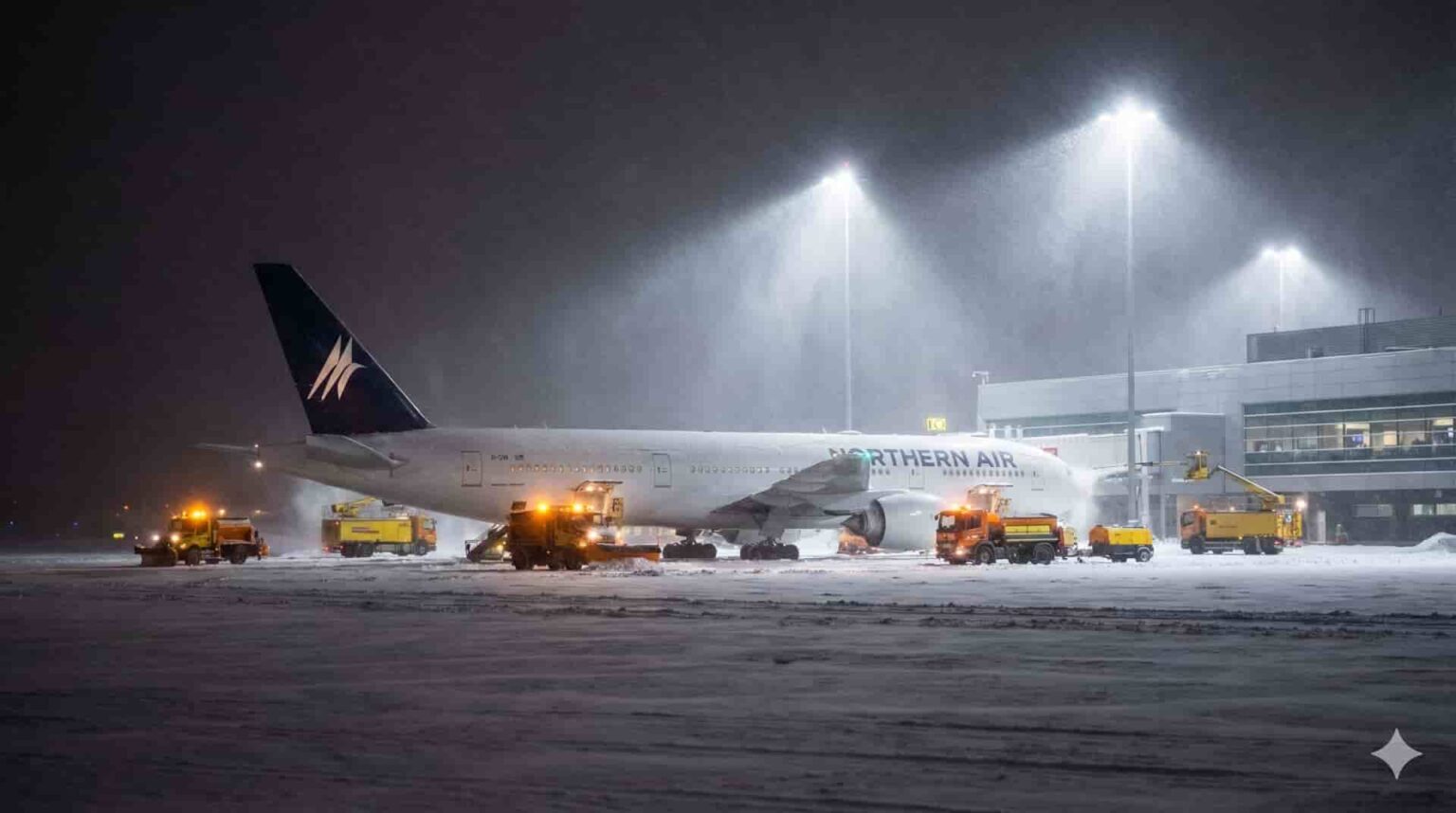 Το πρόβλημα προέκυψε όταν η έντονη χιονόπτωση κατέστησε αδύνατη την ασφαλή απογείωση, αναγκάζοντας τα πληρώματα να κρατήσουν τους επιβάτες εντός των θαλάμων των αεροσκαφών μέχρι το πρωί.
