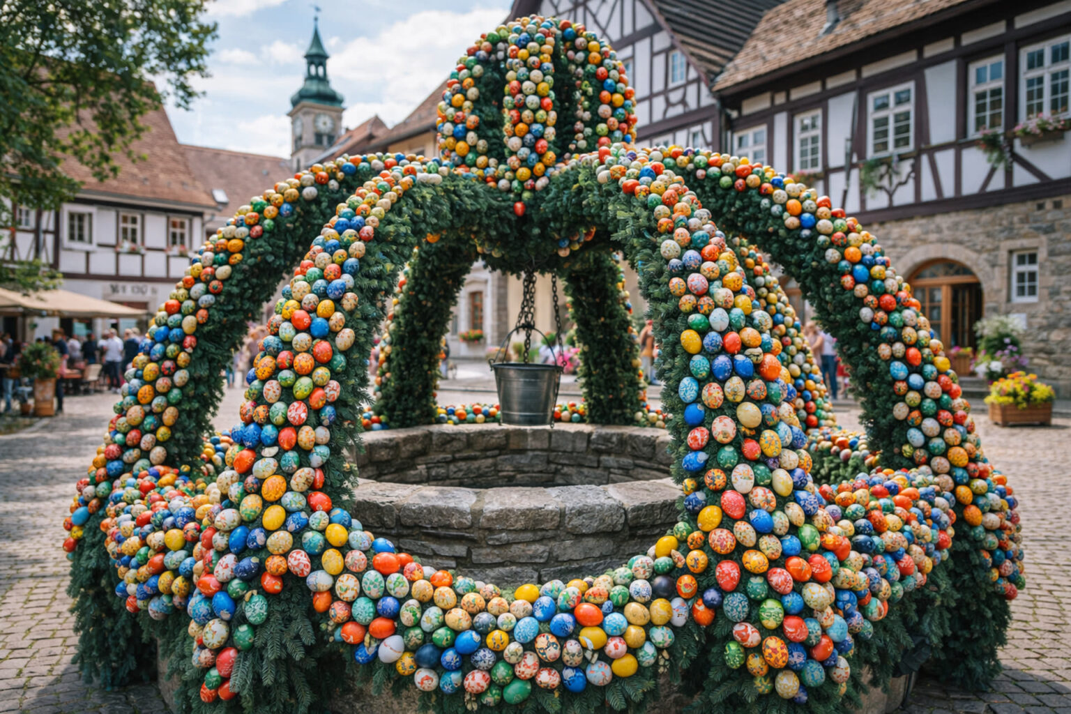 Ανάμεσα στους εκατοντάδες διακοσμημένους σταθμούς νερού, η εγκατάσταση στο μικρό χωριό Bieberbach, το οποίο υπάγεται διοικητικά στην περιφέρεια του Forchheim, κατέχει αναμφίβολα την πρώτη θέση στις προτιμήσεις του ταξιδιωτικού κοινού. Οι τοπικοί σύλλογοι αναλαμβάνουν το τεράστιο έργο της τοποθέτησης περίπου 11.000 βαμμένων αυγών, καθένα από τα οποία φέρει μοναδικά μοτίβα ζωγραφισμένα στο χέρι, συνθέτοντας ένα εντυπωσιακό μωσαϊκό που καλύπτει πλήρως τις ξύλινες και μεταλλικές αψίδες της κεντρικής πηγής. Αυτή η συλλογική προσπάθεια των εθελοντών έχει μεταμορφώσει τον ήσυχο οικισμό σε κορυφαίο προορισμό, με δεκάδες τουριστικά λεωφορεία να καταφθάνουν καθημερινά καθ’ όλη τη διάρκεια των εορτών.