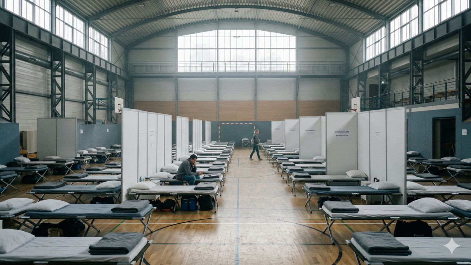 Αυτή τη στιγμή, η πλειονότητα των νεοαφιχθέντων οδηγείται σε μαζικές δομές φιλοξενίας, οι οποίες λειτουργούν αδιάκοπα επί εικοσιτετραώρου βάσεως, παρέχοντας αποκλειστικά τα απολύτως απαραίτητα. Μετασκευασμένα αθλητικά κέντρα, βιομηχανικά υπόστεγα και παλιοί στρατώνες έχουν μετατραπεί σε πρόχειρους κοιτώνες, όπου ο ιδιωτικός χώρος είναι ουσιαστικά ανύπαρκτος. Οι υποδομές αυτές δοκιμάζουν καθημερινά τις αντοχές των ενοίκων τους.