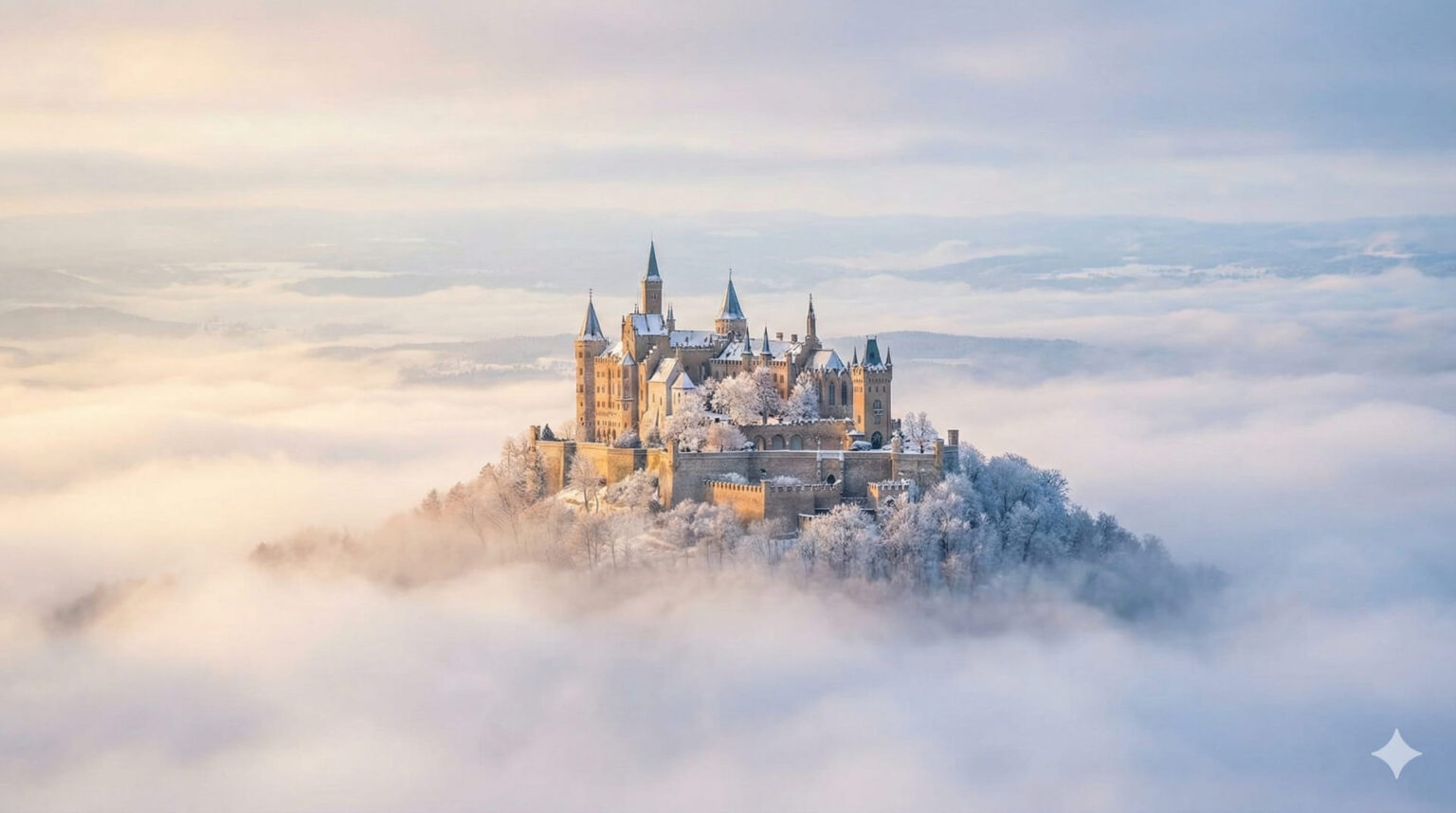 Όταν το χιόνι καλύπτει τη Swabian Alb, το τοπίο αποκτά μια δραματική ένταση. Εδώ δεσπόζει το κάστρο Hohenzollern, το προγονικό λίκνο της τελευταίας αυτοκρατορικής οικογένειας της Γερμανίας. Τον χειμώνα, το κάστρο δεν είναι απλώς ένα κτίριο· μοιάζει με οπτασία. Συχνά, λόγω της ομίχλης που εγκλωβίζεται στην κοιλάδα, οι πύργοι του φαίνονται να αιωρούνται πάνω από τα σύννεφα, αποκομμένοι από τη γη. Είναι μια εικόνα βγαλμένη από τις σελίδες ρομαντικού μυθιστορήματος του 19ου αιώνα.